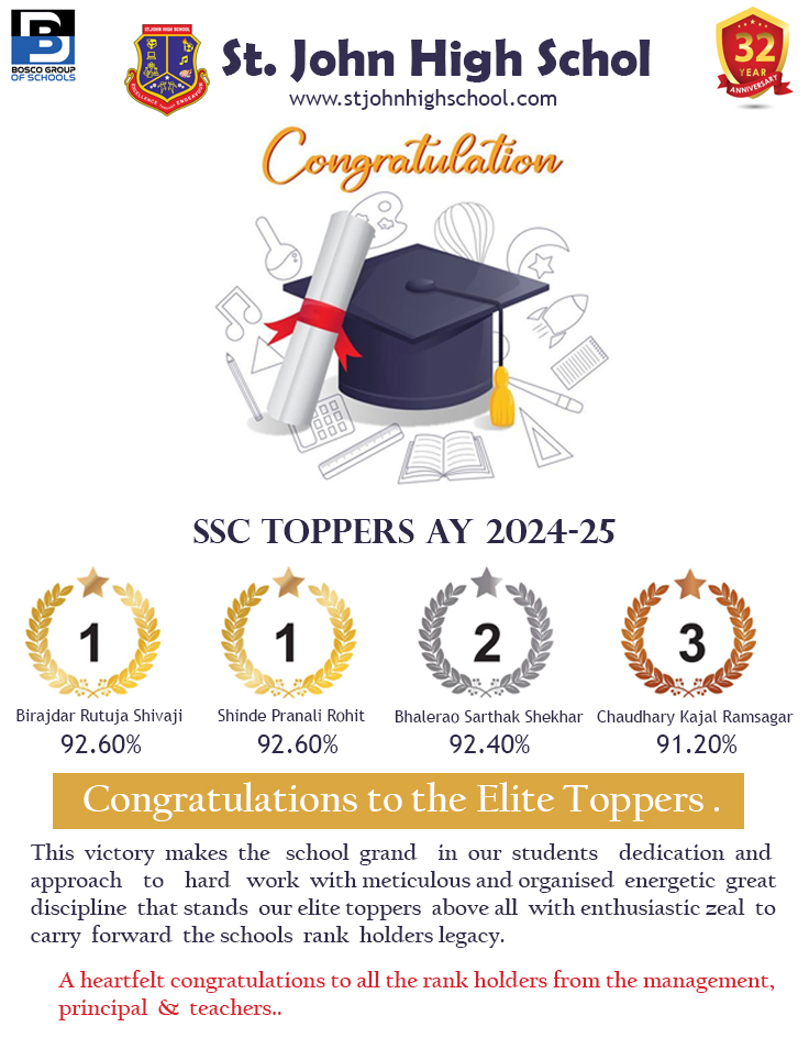 The hallmark of St. John High School is its steadfast belief that self discipline, hard work and integrity are the quintessential qualities in an individual. We do believe that our students will be harbingers of change in this angst ridden world. In some way, albeit a small way, they will influence or lead people with their grace, dignity, valiance and magnanimity.